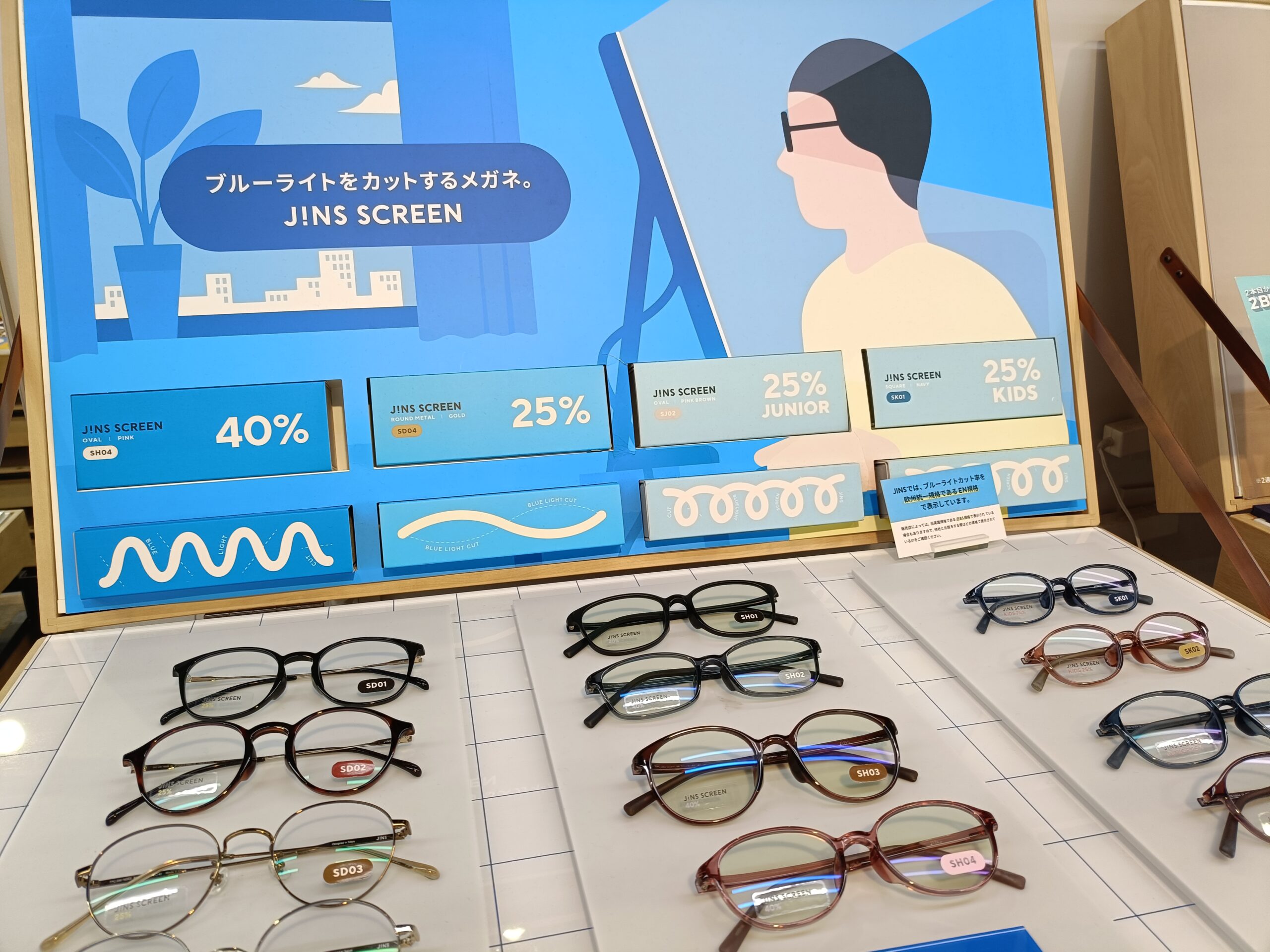 店頭ではブルーライトカットの「JINS SCREEN」や、UV99%カットのレンズ、子ども向けの軽くて曲がりにくいフレームなど、機能性アイテムも豊富で、PC作業用と普段用を使い分けるのにも便利です。