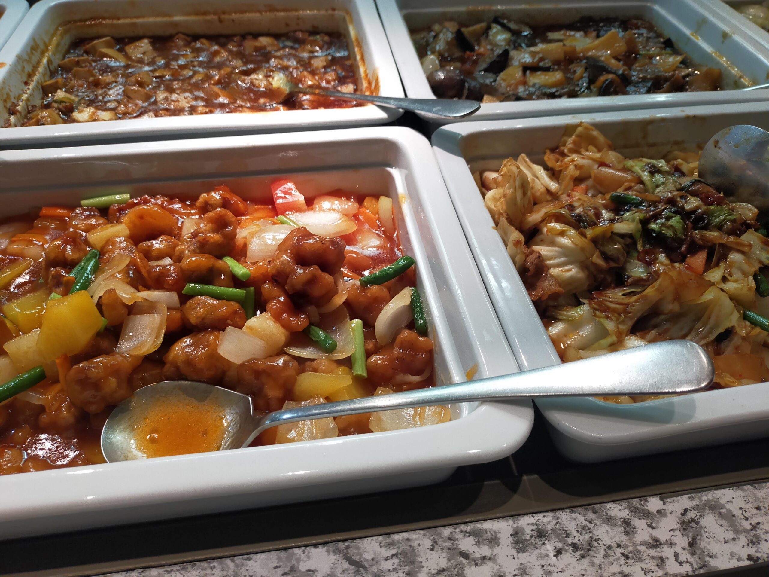 ビュッフェ台には酢豚や八宝菜、麻婆豆腐、油淋鶏といった定番中華に加え、炒飯・焼きそば・スープ・サラダもずらり。大皿から好きな量だけ取れるので、少しずつ色々な料理を味わえるのが楽しいです。飲茶は特に器といい本格的なもので、点心の皮も厚すぎず薄すぎず、ちゃんと専門店クオリティ。目の前で焼いてくれる鉄板メニューや、写真のような揚げ物コーナーもあって、子どもも飽きずに食事を楽しんでいました。